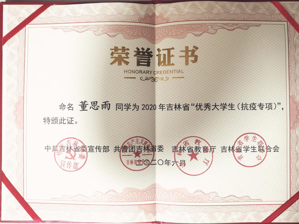 本科生分团委秘书长。本科期间,董思雨多次获得校二等奖学金、单项奖学金、校优秀团干部、校优秀学生干部、校优秀志愿者等荣誉称号。入选“贸仲杯”、“理律杯”以及国际刑事模拟法庭竞赛吉林大学竞赛团队成员,同时担任吉林大学国家级“大学生创新创业训练计划”的项目负责人,荣获省大学生数学建模竞赛二等奖、“互联网+”校赛一等奖、“三创赛”省赛三等奖、“创青春”省赛二等奖和国赛三等奖。每年暑假跟随“思源计划”的队伍到各地进行实践调研,并多次在校级暑期实践评比活动中获奖。在新冠肺炎疫情爆发后,董思雨不仅在第一时间向社区报道,还在服务社区之余加入了新冠肺炎医疗救治定点医院的志愿者队伍,并对援鄂医护人员子女进行陪伴,给予关爱,收到广泛好评。