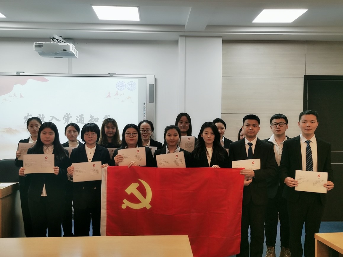 随后,乔敬时同志为每一位新党员颁发《入党通知书》,并在党旗下合影留念,记录这光荣、难忘的一刻。乔敬时同志说,2020年是不平凡的一年,有无数的同志用实际行动践行着“随时准备为党和人民牺牲一切”。希望每一位新党员都铭记入党誓词,做一名合格且优秀的中国共产党党员。此次仪式在慷慨激昂的《国际歌》的旋律中结束。