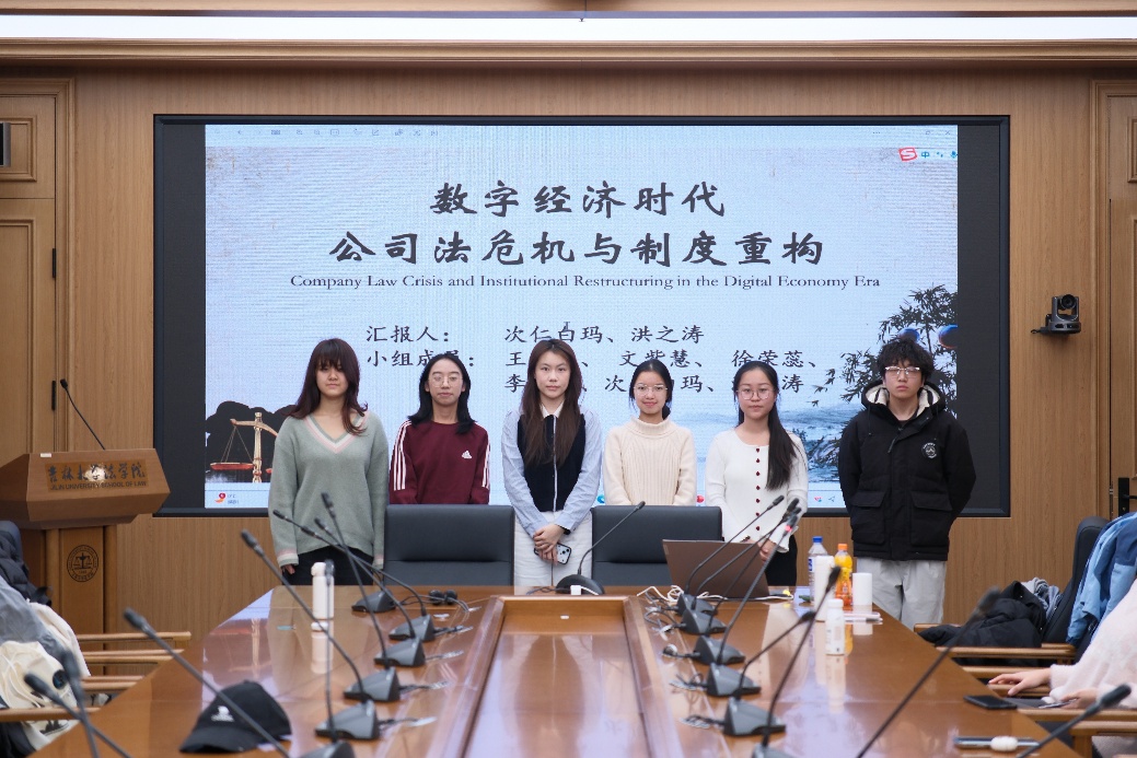 次仁白玛、洪之涛团队的汇报聚焦数字经济时代公司法危机与制度重构问题,次仁白玛同学首先提出数字经济下传统公司法的适配困境:“标准公司模型”失效、核心制度与司法功能弱化、公司治理结构性变迁,进而梳理出对代理人成本关注不足、实际控制人规制缺位等四大核心危机。随后,洪之涛同学对比2023年新《公司法》与旧法,指出在董事义务、实控人责任等方面有修订,但仍存深层矛盾未解决,最终建议转向“接口式”立法、构建权责统一的治理新生态。