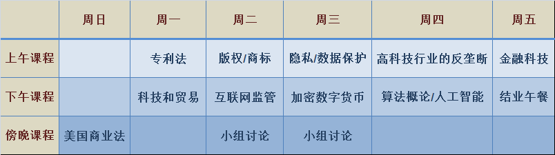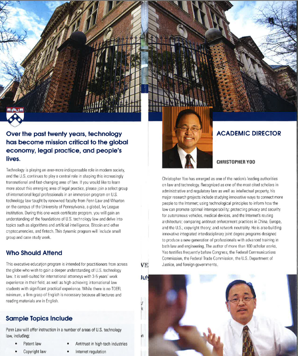 暑期美国法律与科技证书,为期一周。这个课程将使与会者理解美国科技法律的基础原理 — 专利法、著作权法、反垄断在高科技产业,互联网监管,隐私和数据保护的应用,并深入研究的话题,例如算法和人工智能,比特币和其他加密数字货币,以及金融科技。该课程由宾夕法尼亚大学线上赌博