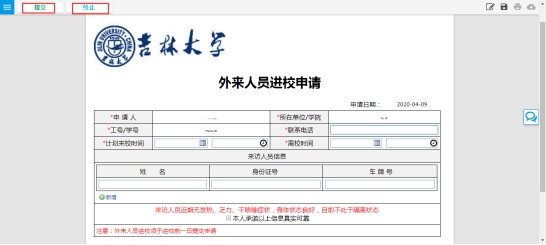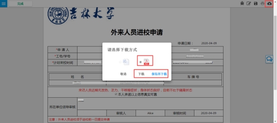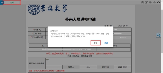 申请人确认时可在右上角下载《吉林大学外来人员入校许可》 或是点击完成办理后时直接下载,如下图所示: