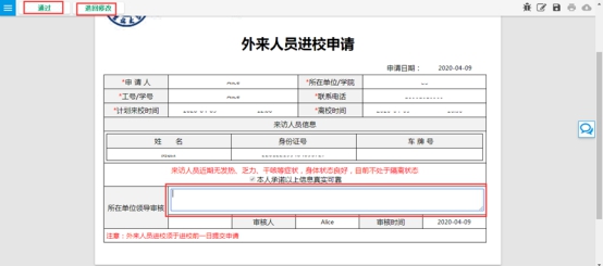 下图所示为领导审批页面,可通过或退回申请人修改: