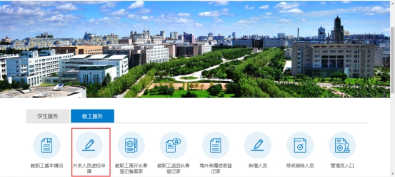 在教工服务中,找到”校外人员入校申请” 点击发起,如下图所示: