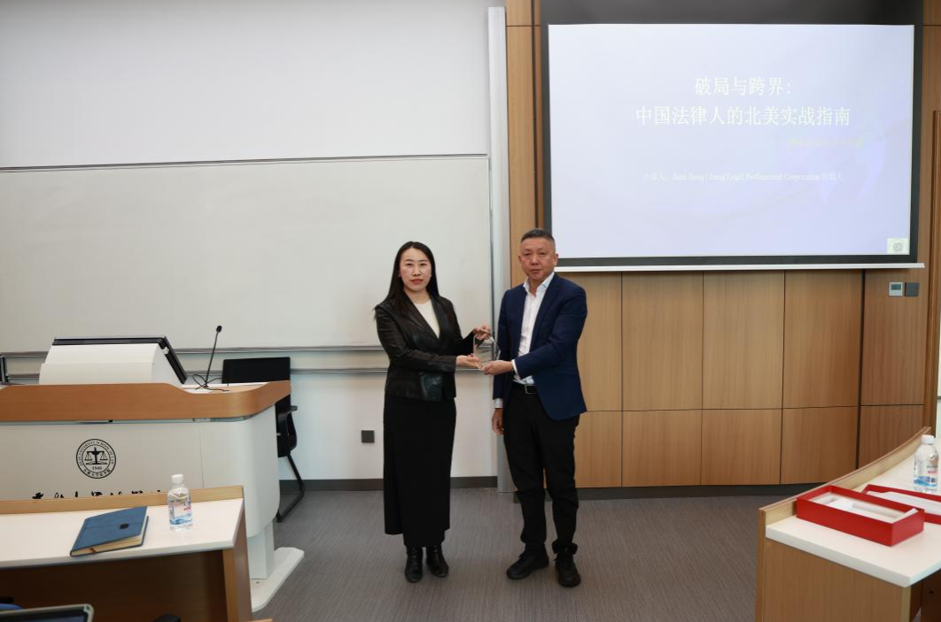 人才培养的重要方向,姜艳丽律师深耕涉外法律领域多年,拥有丰富的跨境实务经验与行业一线视角,其分享对同学们明晰职业方向、提升专业素养、树立国际视野具有重要指导意义。张俊峰副书记代表学院向姜艳丽律师颁发讲座纪念奖牌,致谢其为学院学子带来高质量职业分享。