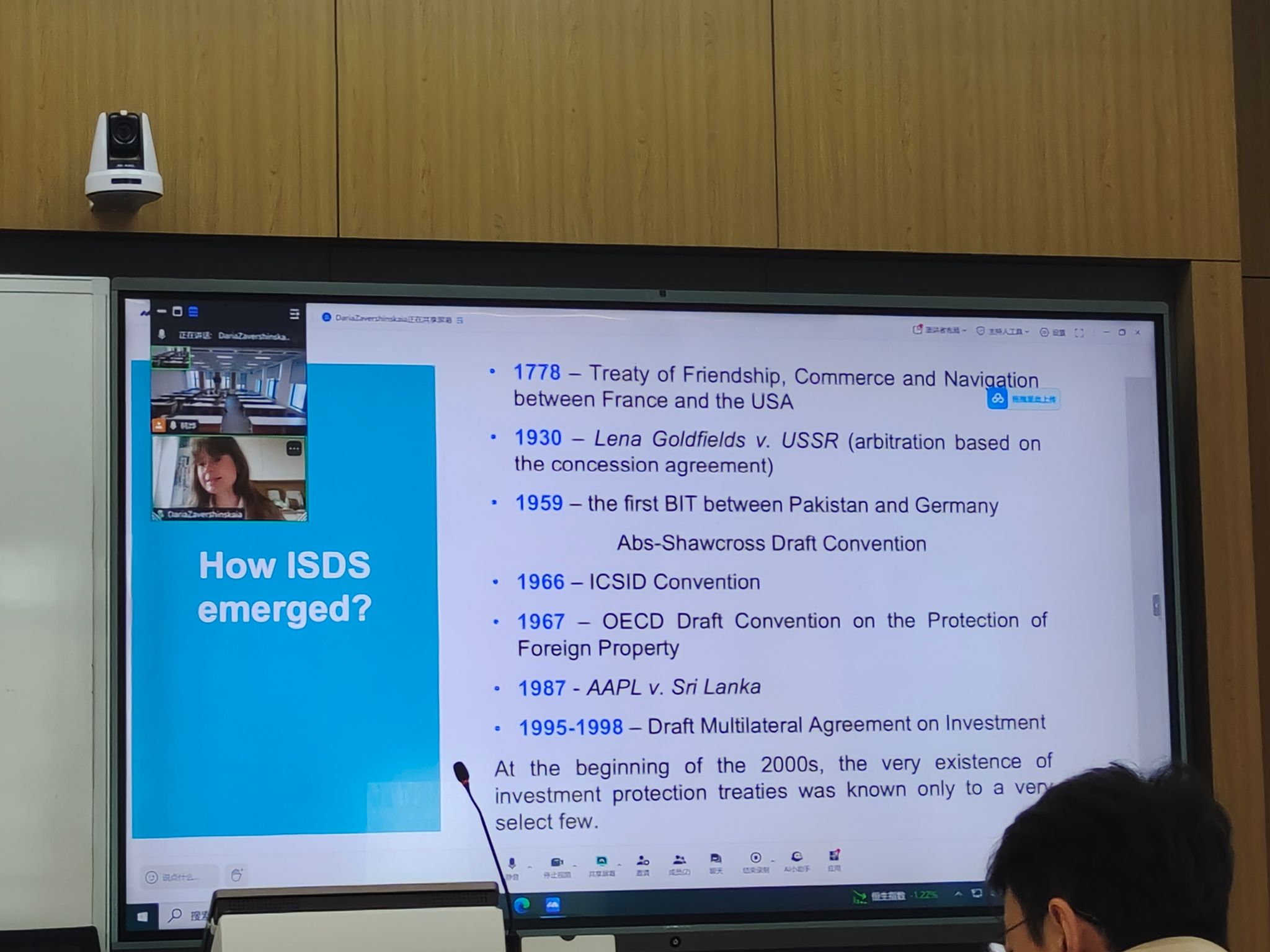 讲座伊始,达里娅·扎韦尔申斯卡娅从国际投资仲裁的历史发展切入,系统梳理了投资者—国家争端解决机制(ISDS)的生成脉络,重点回顾了早期友好通商航海条约、双边投资协定、ICSID公约等关键制度节点,并结合近年来国际投资仲裁案件的数量、争议金额及平均审理周期等数据,阐述了当前国际投资仲裁的发展趋势。